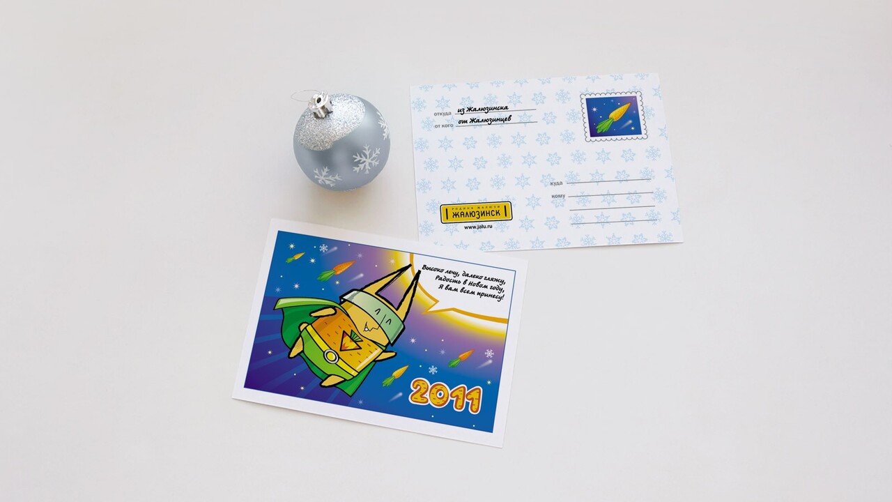 Новогодняя открытка выдержана в одном стиле с календарем, однако обладает своей неповторимой особенностью. Она стилизована под почтовую открытку: на обратной стороне изображена марка. Кроме того, открытка сохраняет линовку «Куда» и «Откуда», что даёт сотрудникам компании «Жалюзинск» возможность сердечно и дружественно вписать имя получателя от руки.