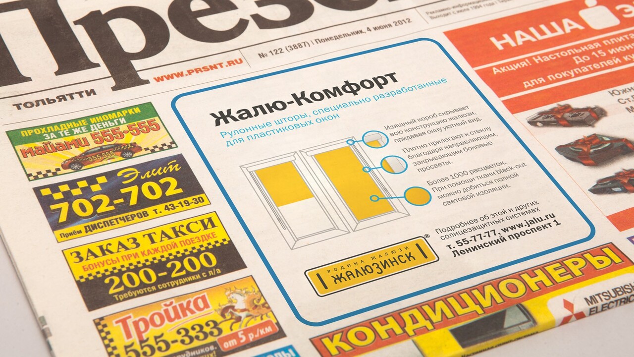 ЗАДАЧА: Сконструировать серию газетных рекламных модулей для компании «Жалюзинск», которые представят конкретные виды солнцезащитной продукции.