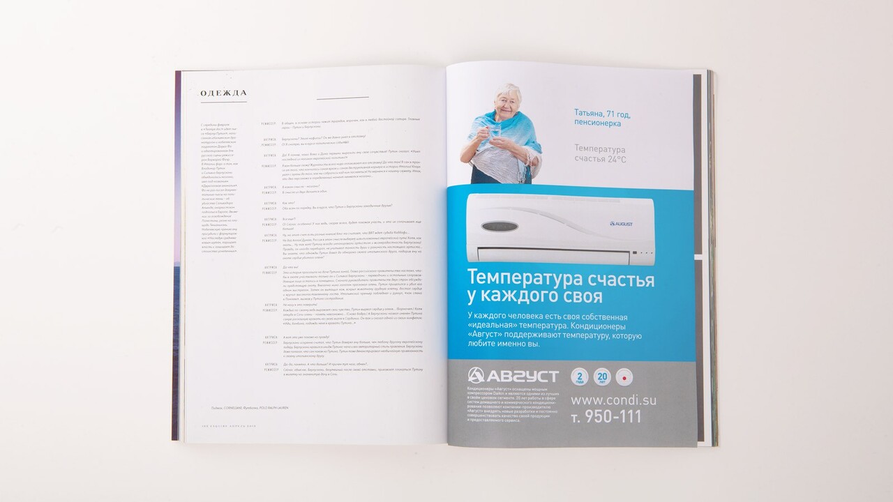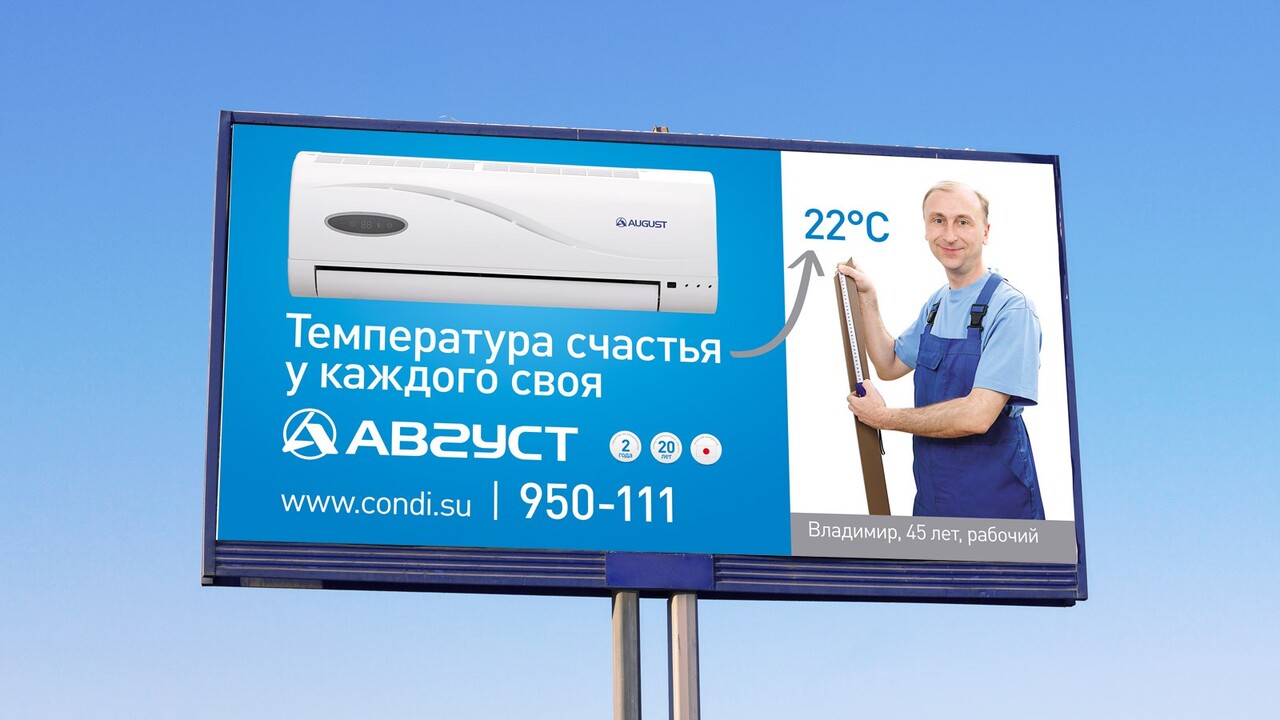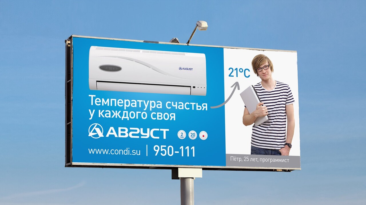 ВОПЛОЩЕНИЕ: Рекламная кампания была проведена в два этапа. Сначала жители Самарской области были заинтригованы тизерным посланием: «А какая Ваша температура счастья?». А затем познакомились с фирменными персонажами разных возрастов и профессий, которые рассказывали о том, как им удаётся поддерживать свою «температуру счастья» при помощи кондиционеров «Август». Помимо разработки дизайн-макетов наружной рекламы, производственный процесс включал в себя создание сайта, буклетов и флаеров для дилеров и покупателей.