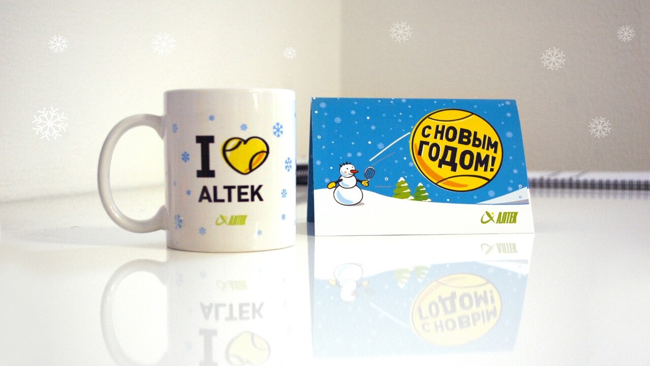 РЕШЕНИЕ: На кружку нанесено послание «I love Altek = I love tennis», и в нем знак «love» выполнен в виде сердца, напоминающего теннисный мяч. Глянцевое покрытие и яркие цвета открытки привлекают внимание адресата. С подачи снеговика прямо в руки летит теннисный мяч с новогодним поздравлением. Внутри на фоне падающего снега – слова поздравления, подписанные директором комплекса.