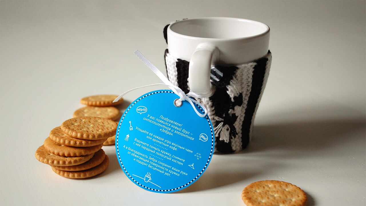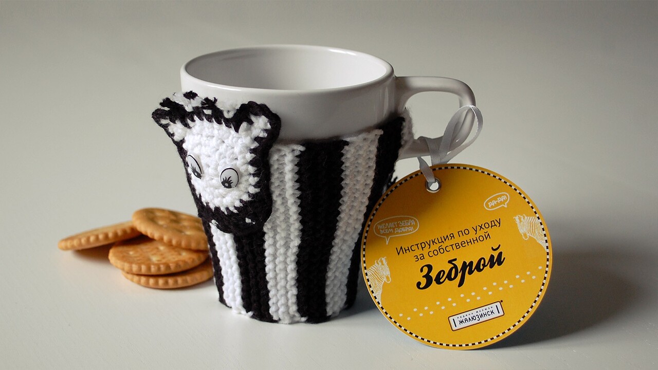 РЕШЕНИЕ: Ручная зебра – это кружка в вязаной полосатой зебровой шубке. Уютный и домашний аксессуар способен умерить жар душистого чая и ароматного кофе, обжигающих руки. А чтобы подарок был оценен по достоинству и раскрыл все свои преимущества, кружка сопровождается яркой и шуточной инструкцией о том, как ухаживать за новообретенным другом-зеброй.