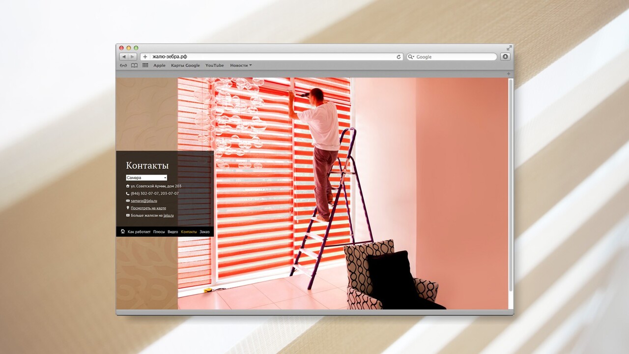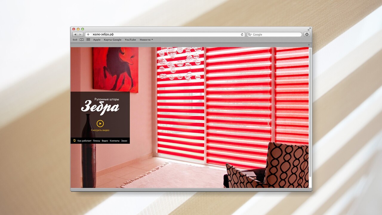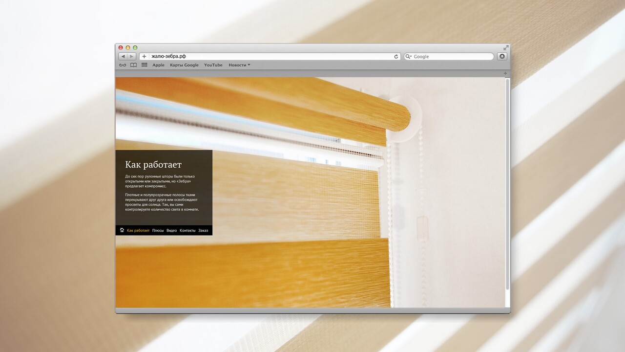 РЕШЕНИЕ: Визуальная составляющая – демонстрация принципа и эффекта работы «Зебры» – стала главным наполнением сайта. Изюминка – видеоролик, который предлагает увидеть жалюзи и их эффект в действии. Специально для сайта проводилась фото и видеосъемка, в которой нам удалось запечатлеть неуловимую игру света и тени.