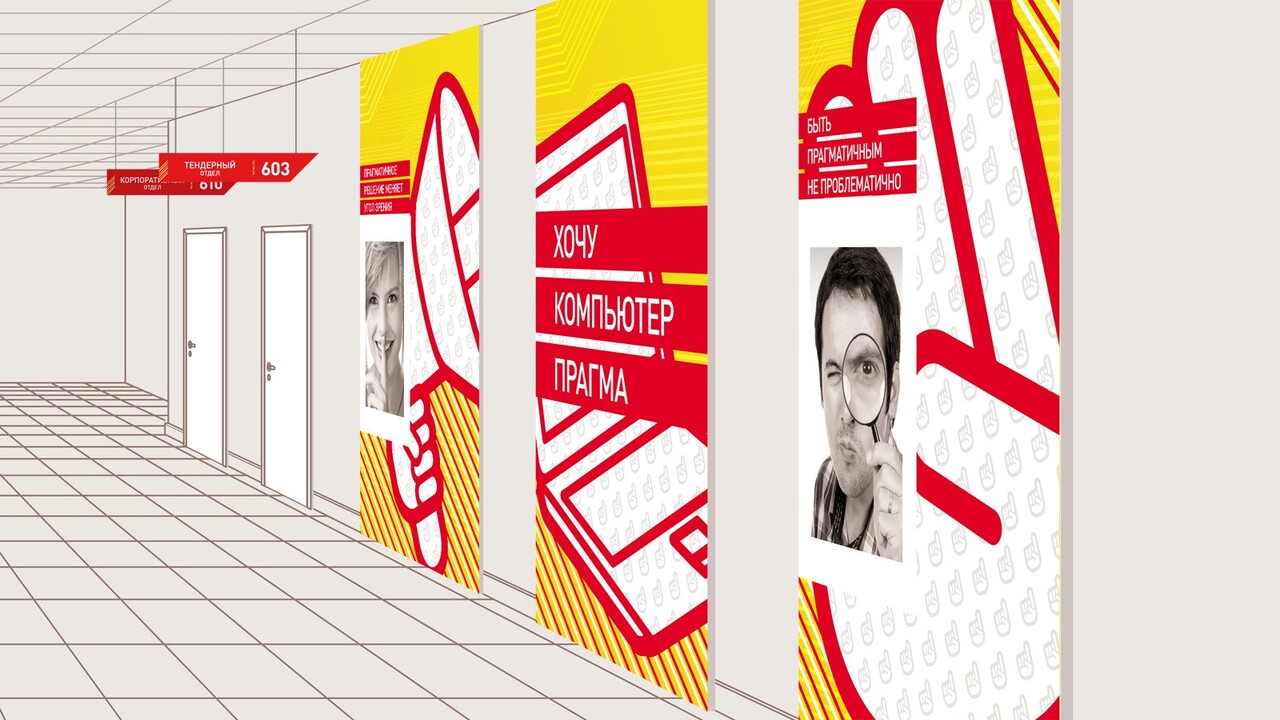 РЕШЕНИЕ: В ходе реализации проекта было разработано несколько типов носителей: навигационные элементы, входная группа и плакаты. В унылом сером коридоре по обеим сторонам появились яркие цветовые пятна, радующие взгляды как гостей офиса, так и работников. На плакатах - подборка из забавных фотографий, веселых рифмованных слоганов и графических элементов. А перенесение фирменного стиля с малых носителей на офисное пространство позволило расширить Прагма-мир.