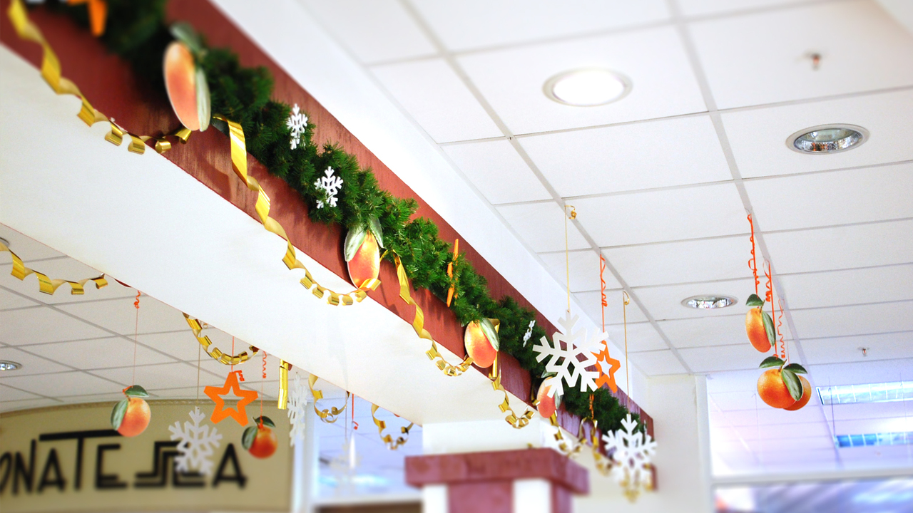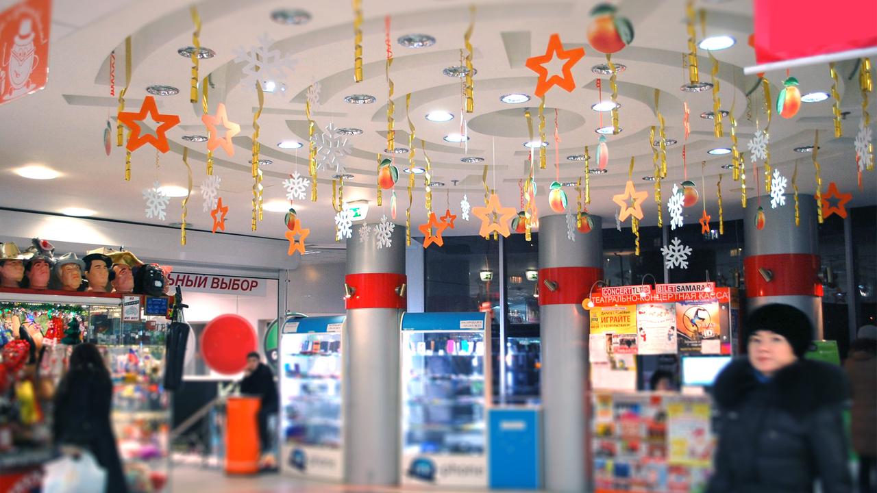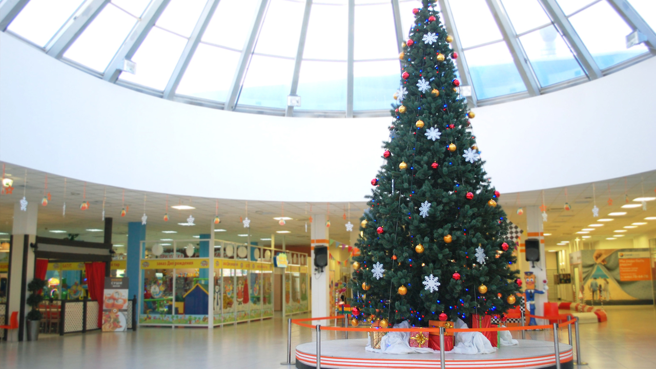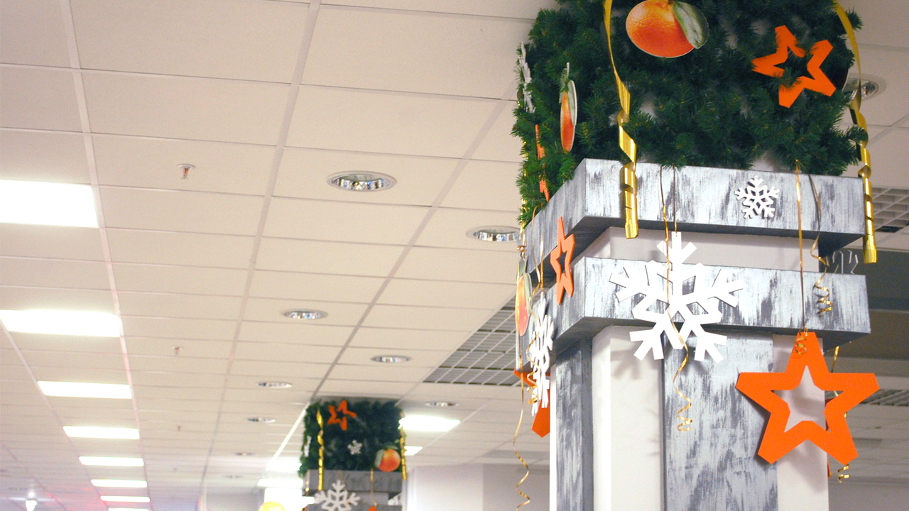 РЕШЕНИЕ: Концепция «Мандариновая зима». Яркие и сочные мандарины — знакомые с детства символы Нового года. Зимой 2014 года ТРК «КАПИТАЛ» превращается в мандариновый сад. В оформлении используются тематические образы золотисто-оранжевого цвета, напоминающие, кроме того, круглый оранжевый логотип ТРК.
