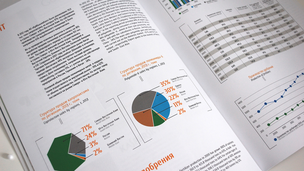 РЕШЕНИЕ: Обложка открывает тему химической формулы, вводит на страницу форму семигранника (характерную для продукции; например, капролактама). Т.к. текст представлен на двух языках, то очередность восприятия информации определена цветом и яркостью. Таким образом, иноязычным дублем-колонкой обзаводится каждый текст. В колонтитулы вынесены логотип завода, надпись «Годовой отчет». Номера страниц заключены в семигранник.