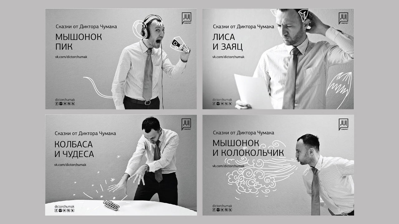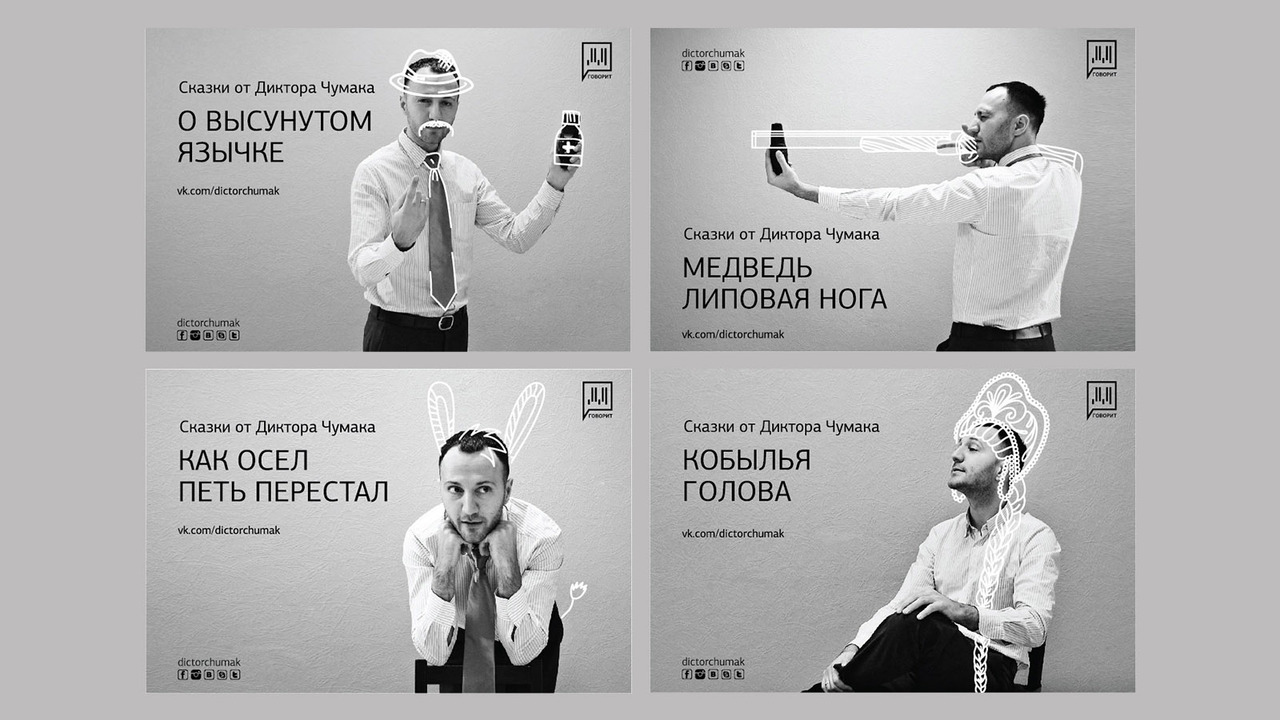 РЕШЕНИЕ. для проекта была проведена фотосъемка и нарисованы иллюстрации к каждой сказки. В роли модели выступал Диктор Чумак.